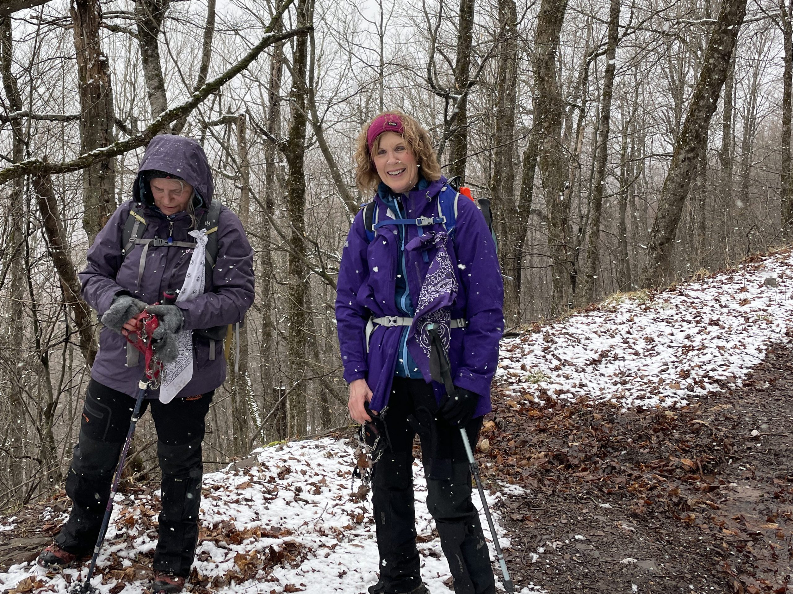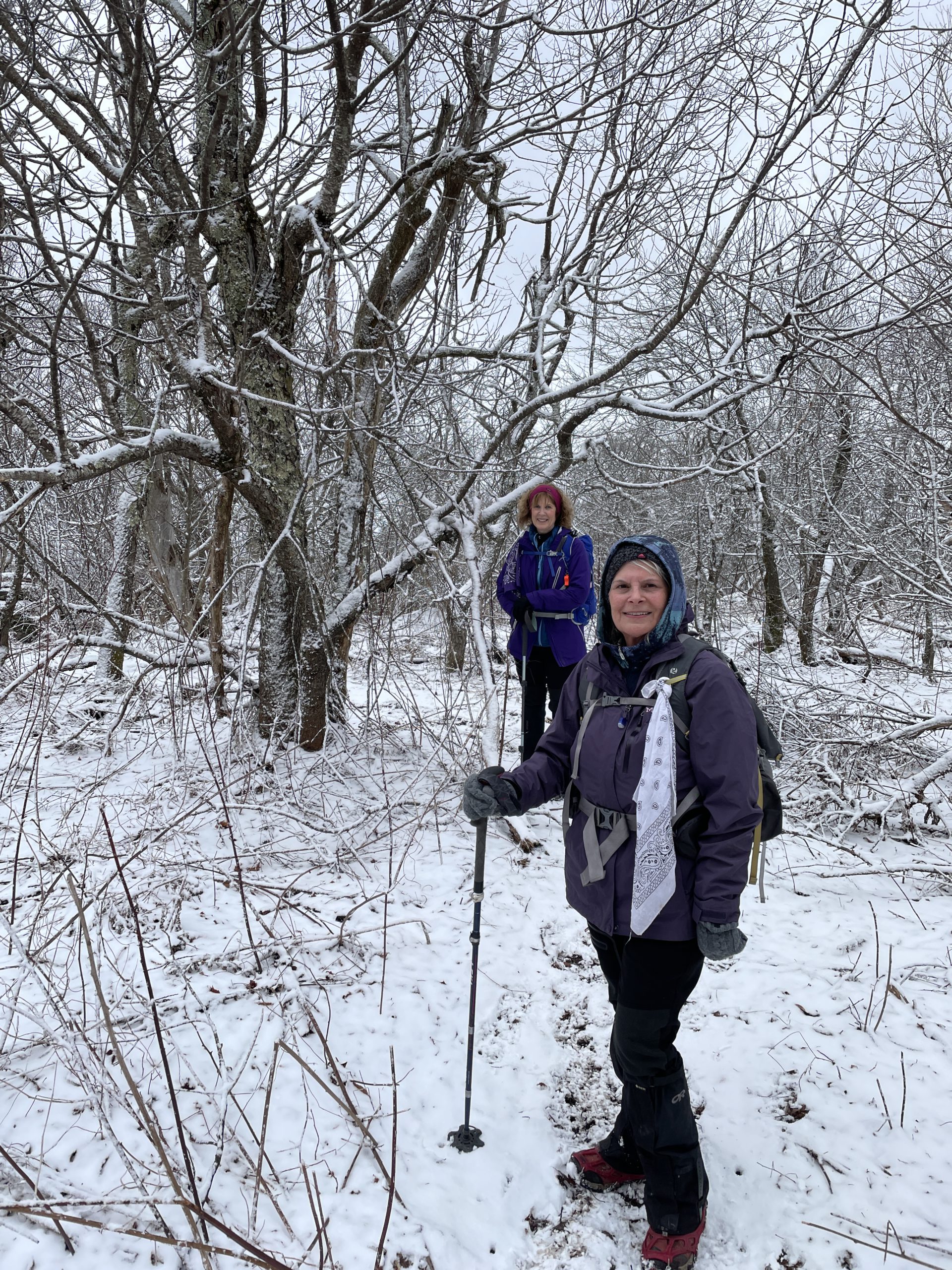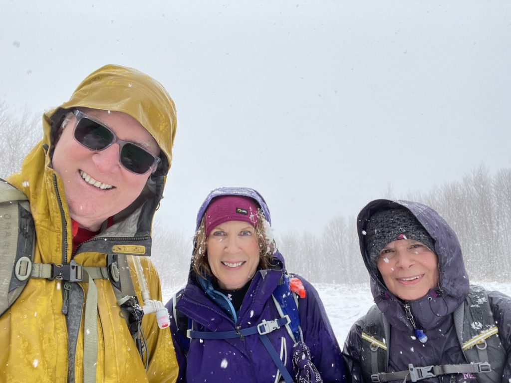 Me, Geri and Patty. Weather forecast was for some rain in the afternoon so we were not expecting about 3″ of snow on Bearpen. Luckily it was only above 3000 feet, but it was very wet and stuck so badly to the spikes we had to take them off.