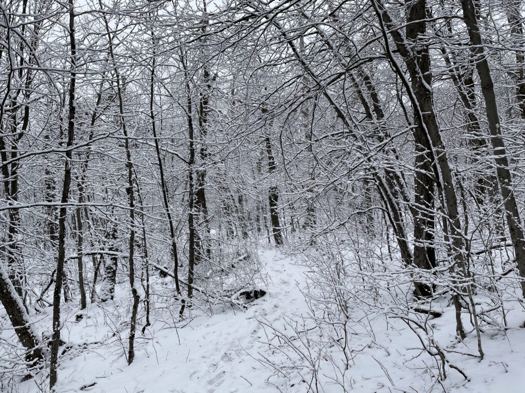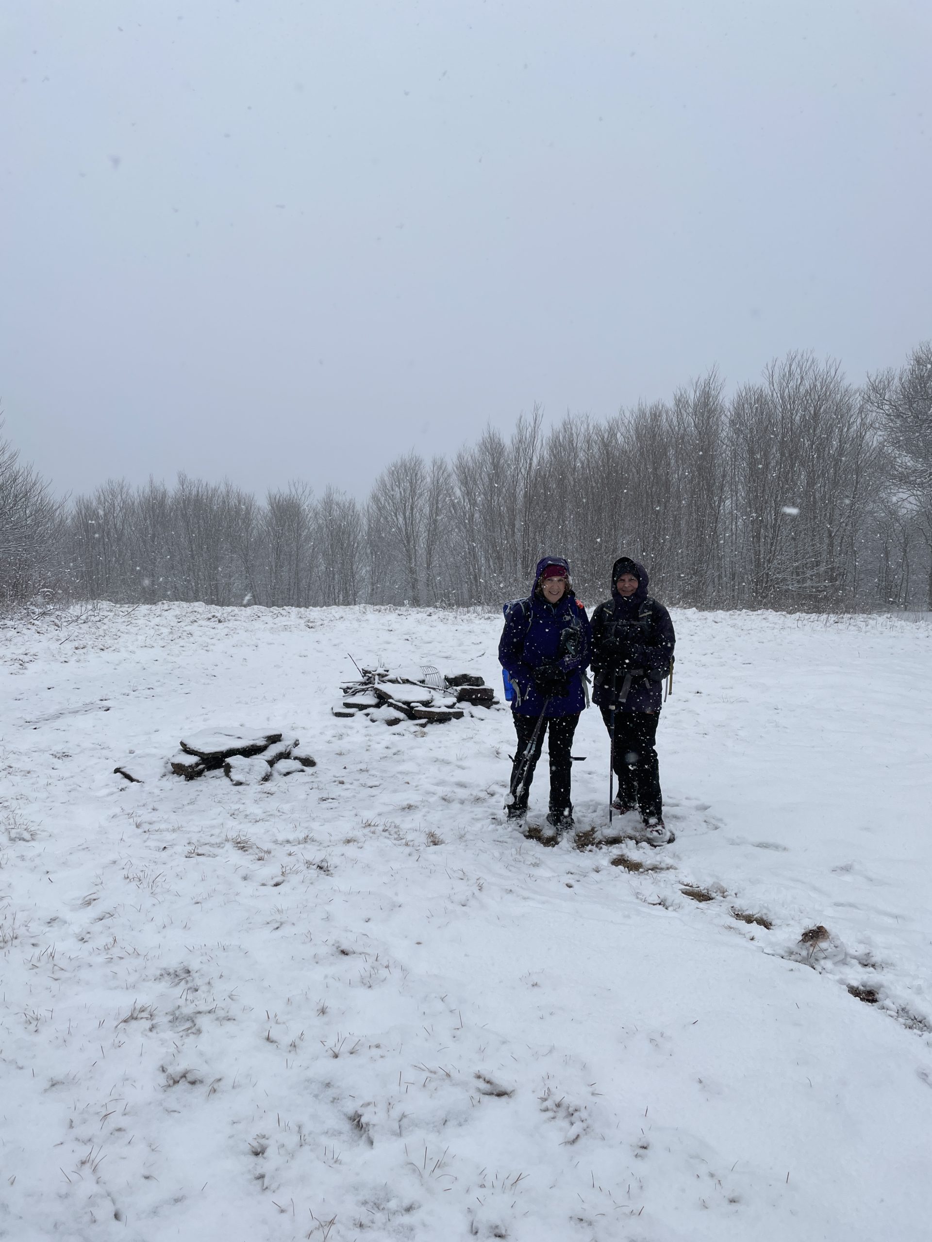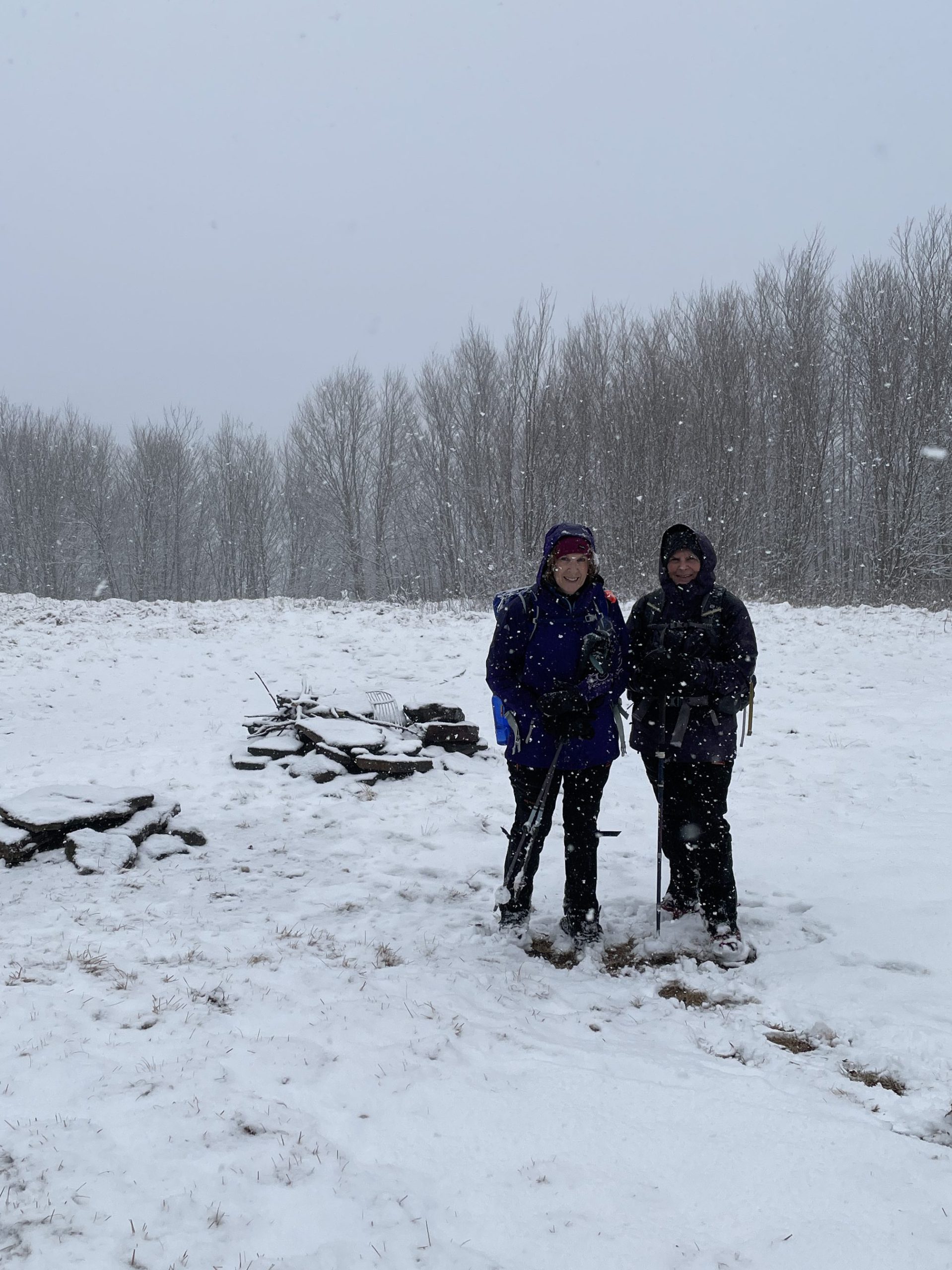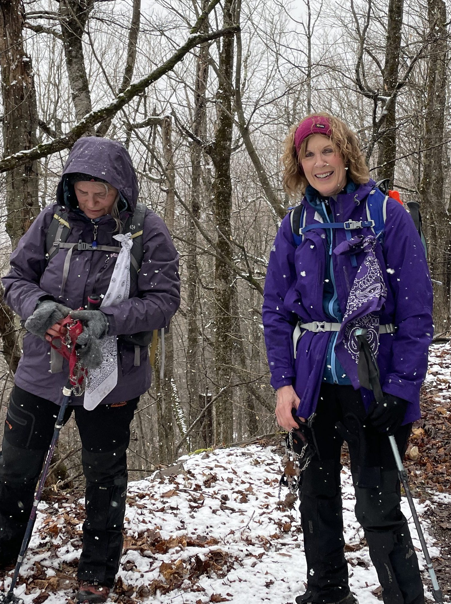 Me, Geri and Patty. Weather forecast was for some rain in the afternoon so we were not expecting about 3″ of snow on Bearpen. Luckily it was only above 3000 feet, but it was very wet and stuck so badly to the spikes we had to take them off.